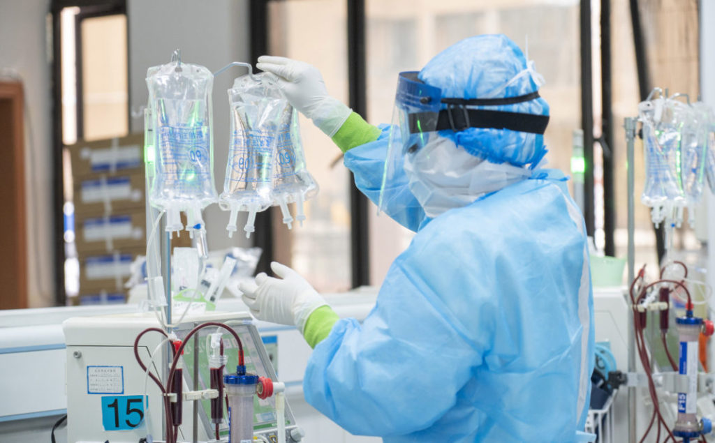 (200321) -- WUHAN, 21 marzo, 2020 (Xinhua) -- Una trabajadora médica realiza un tratamiento de hemodiálisis a un paciente urémico recuperándose de infección por COVID-19 en el Hospital Hankou en Wuhan, capital de la provincia de Hubei, en el centro de China, el 21 de marzo de 2020. Los médicos del centro de hemodiálisis del departamento de nefrología del Hospital Hankou se han apegado a sus puestos durante el brote epidémico del nuevo coronavirus. Además de llevar a cabo un tratamiento de purificación de la sangre para pacientes con COVID-19 en condiciones críticas, ellos también realizan tratamiento de hemodiálisis para unos 40 pacientes urémicos que se recuperan de la infección por COVID-19 cada semana. (Xinhua/Cai Yang) (jg) (rtg)