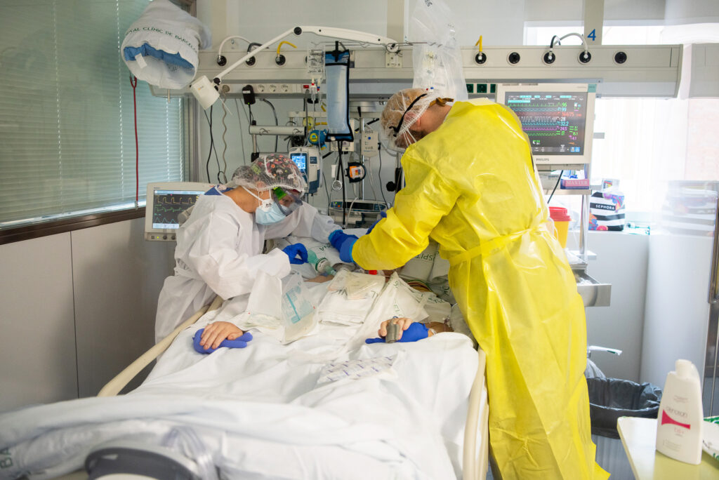 (201106) -- BARCELONA, 6 noviembre, 2020 (Xinhua) -- Imagen del 5 de noviembre de 2020 de trabajadores médicos atendiendo a un paciente de la COVID-19 en un hospital, en Barcelona, España. El número total de infecciones de la COVID-19 desde el comienzo de la pandemia en España ha excedido las 1.3 millones el jueves, de acuerdo con el Ministerio de Salud del país. (Xinhua/Francisco Avia) (ra) (da) (vf) (dp)