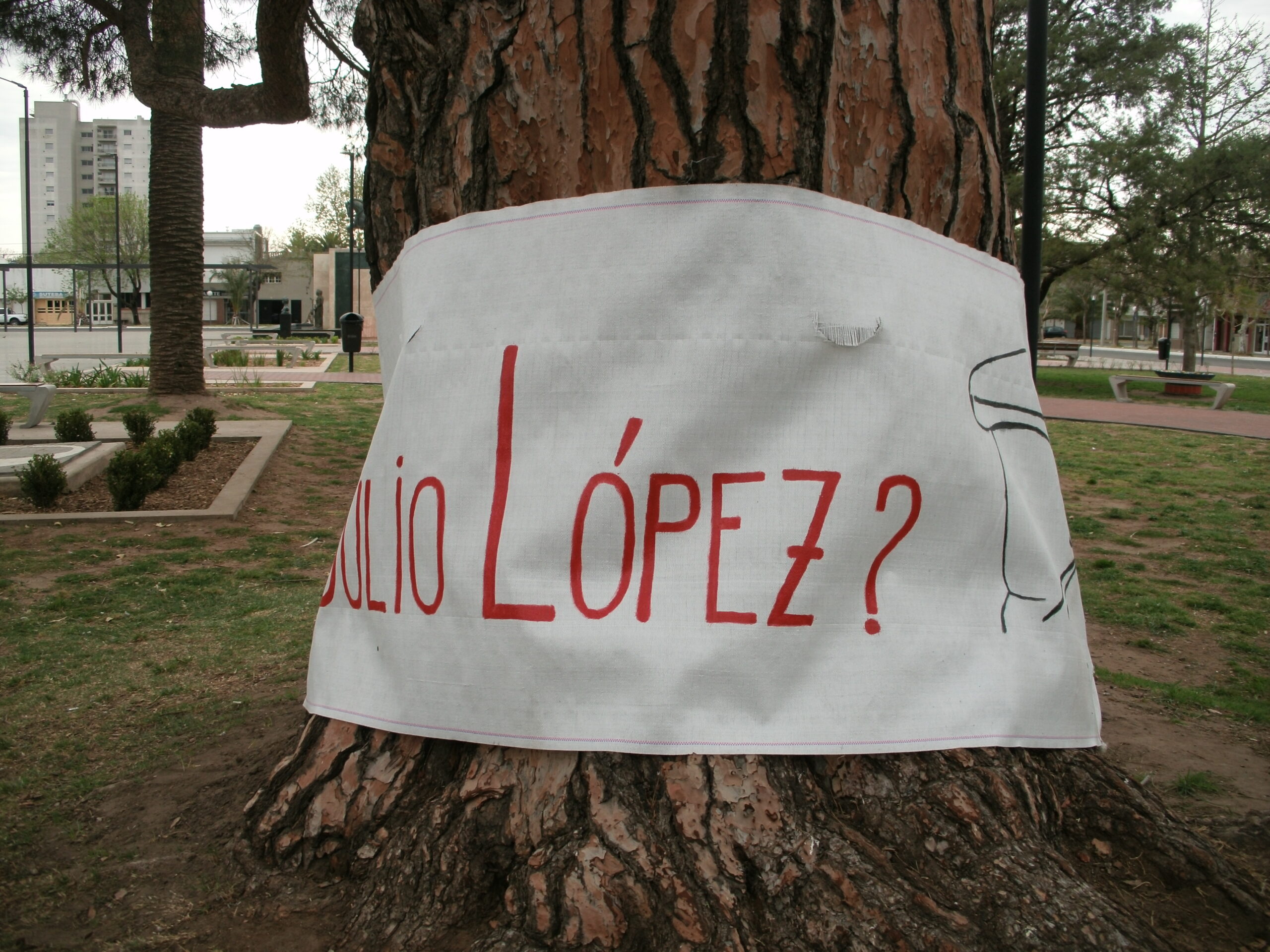 La Plaza San Martín de Trenque Lauquen aloja desde hace más de 80 años un retoño del pino de San Lorenzo, crecido como árbol majestuoso que le otorga al espacio público una distinción entre otras plazas. A media mañana del domingo 18 de septiembre de 2022, cuando se cumplen dieciséis años de su segunda desaparición, la bandera que se pregunta «¿Y Julio López?» quedó amarrada al enorme tronco del pino emparentado con la historia grande de nuestro país.