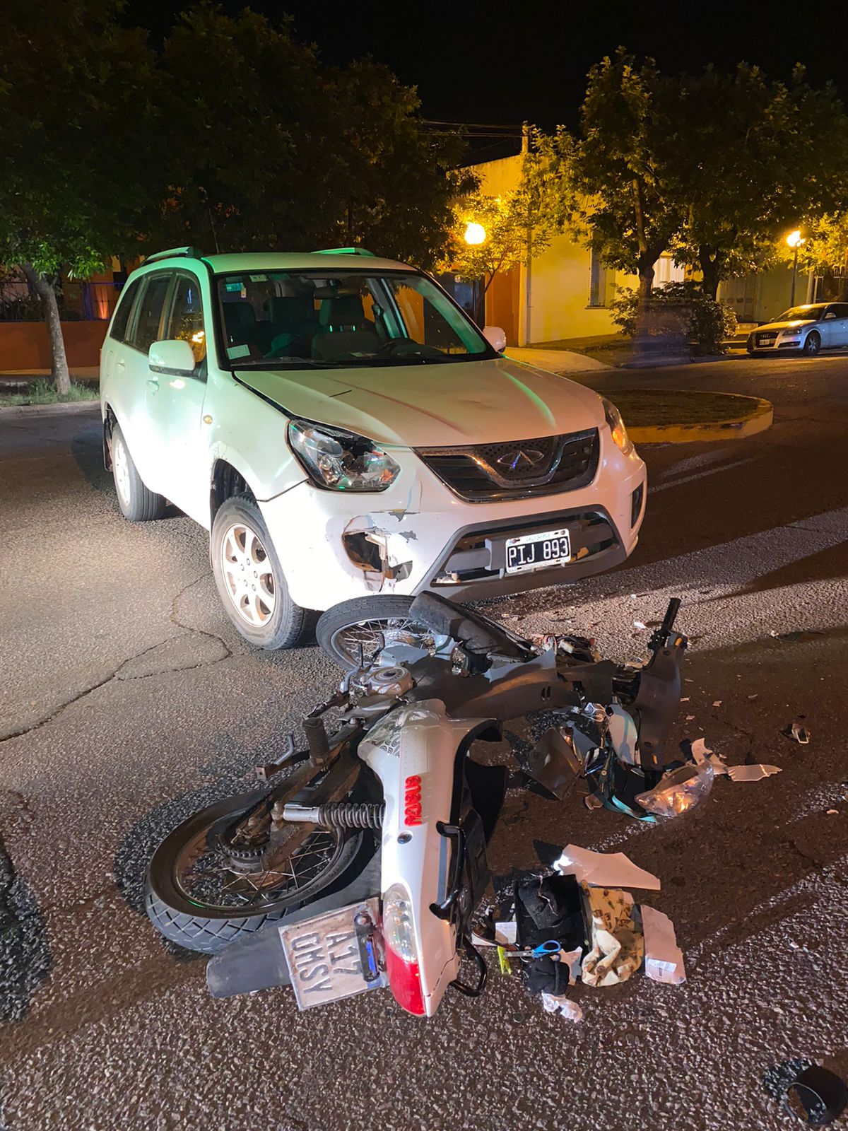 El sábado en horas de la noche colisionó en intersección de calles Sáenz Peña y Rivadavia un vehículo marca Chery modelo Tiggo conducido por Sanchez Martina, de 37 años de edad, con moto marca Corven modelo 110cc conducida por Santangelo Tomas de 24 años de edad.