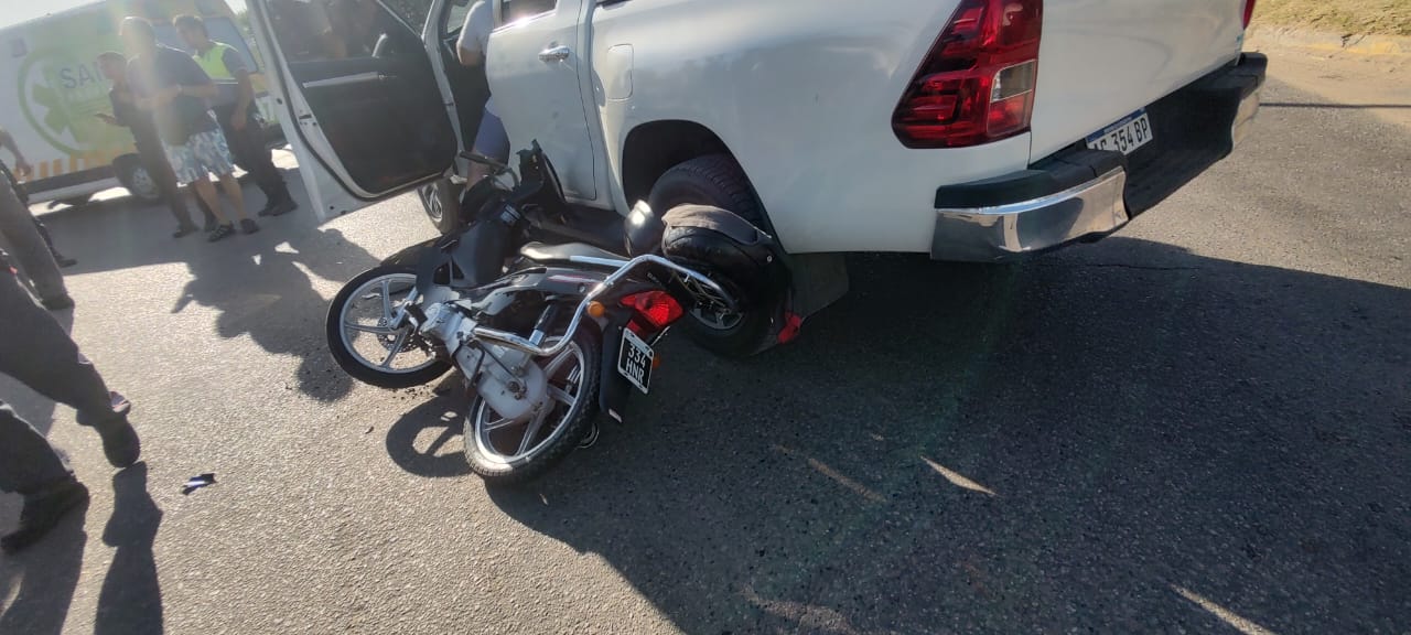 La camioneta, una Toyota Hilux, era guiada por Campelo Hugo Daniel, y la moto, una 110 era conducida por Campos Kevin que como consecuencia del impacto sufrió la fractura de una de sus muñecas, se informó oficialmente.