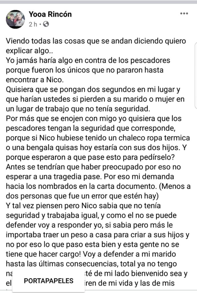 Por más que se enojen conmigo yo quisiera que los pescadores tengan la seguridad que corresponde, porque si Nico hubiese tenido un chaleco, ropa térmica o una bengala quizás hoy estaría con sus dos hijos. ¿Y por qué esperaron a que pase esto para pedírselo? Antes se tendrían que haber preocupado por eso no esperar a una tragedia pase. Por eso mi demanda hacia los nombrados en la carta documento. (Menos a dos personas que fue un error que estén hay).