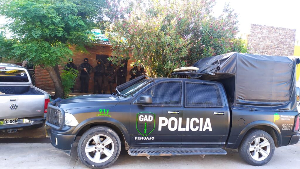 Contándose con los medios logísticos y personal de Estación Comunal Pehuajo, Subestación de Policía Juan José Paso, actuando en conjunto con personal D.D.I. Trenque Lauquen, Patrulla Rural Pehuajo y G.A.D. Pehuajo, arriban a la localidad de 9 de Julio, en donde ejecutan las ordenes de allanamientos, libradas por el Juzgado de Garantías N° 2 de Trenque Lauquen, arrojando resultado altamente pósitivo con detenidos y secuestro de armas.