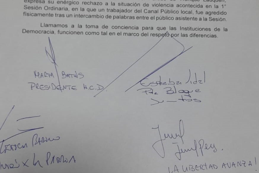 “El Honorable Concejo Deliberante del Partido de Trenque Lauquen, expresa su enérgico rechazo a la situación de violencia acontecida en la Primera Sesión Ordinaria, en la que un trabajador del Canal Público local fue agredido físicamente tras un intercambio de palabras entre el público asistente a la Sesión.