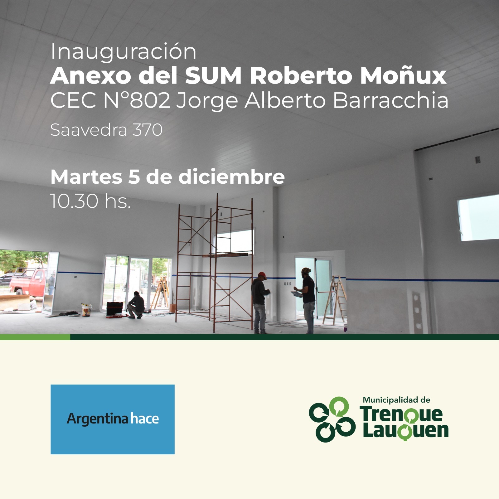 La municipalidad de Trenque Lauquen dejará inaugurado mañana (martes) a las 10.30 el Anexo del SUM Roberto Muñox del CEC nº 802 Jorge Alberto Barracchia, ubicado en calle Saavedra nº 370.
