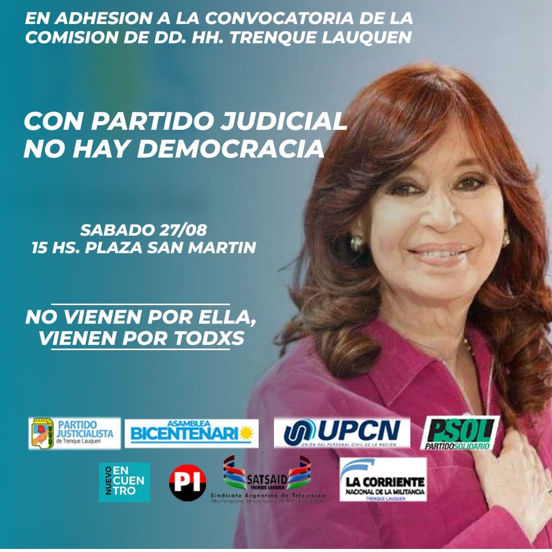 «Este sábado a las 15 hs nos vamos a estar concentrando en plaza San Martin para defender la democracia y a nuestra líder política. Esto no solo es un atropello contra la presunción de inocencia, sino que vulnera las garantías y derechos de toda la población» señala un comunicado del Partido Justicialista local.