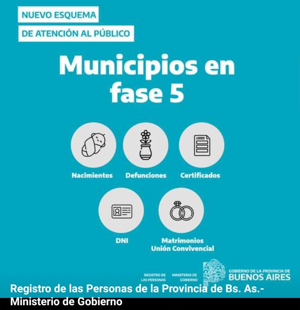 De esa forma, en las Delegaciones de municipios en Fase 5 se podrán tramitar inscripciones de nacimientos, defunciones, certificados, Documento Nacional de Identidad (DNI), casamientos y uniones convivenciales. En todos los casos, solo se realizarán trámites para los casos en que el solicitante acredite domicilio legal en el municipio correspondiente.