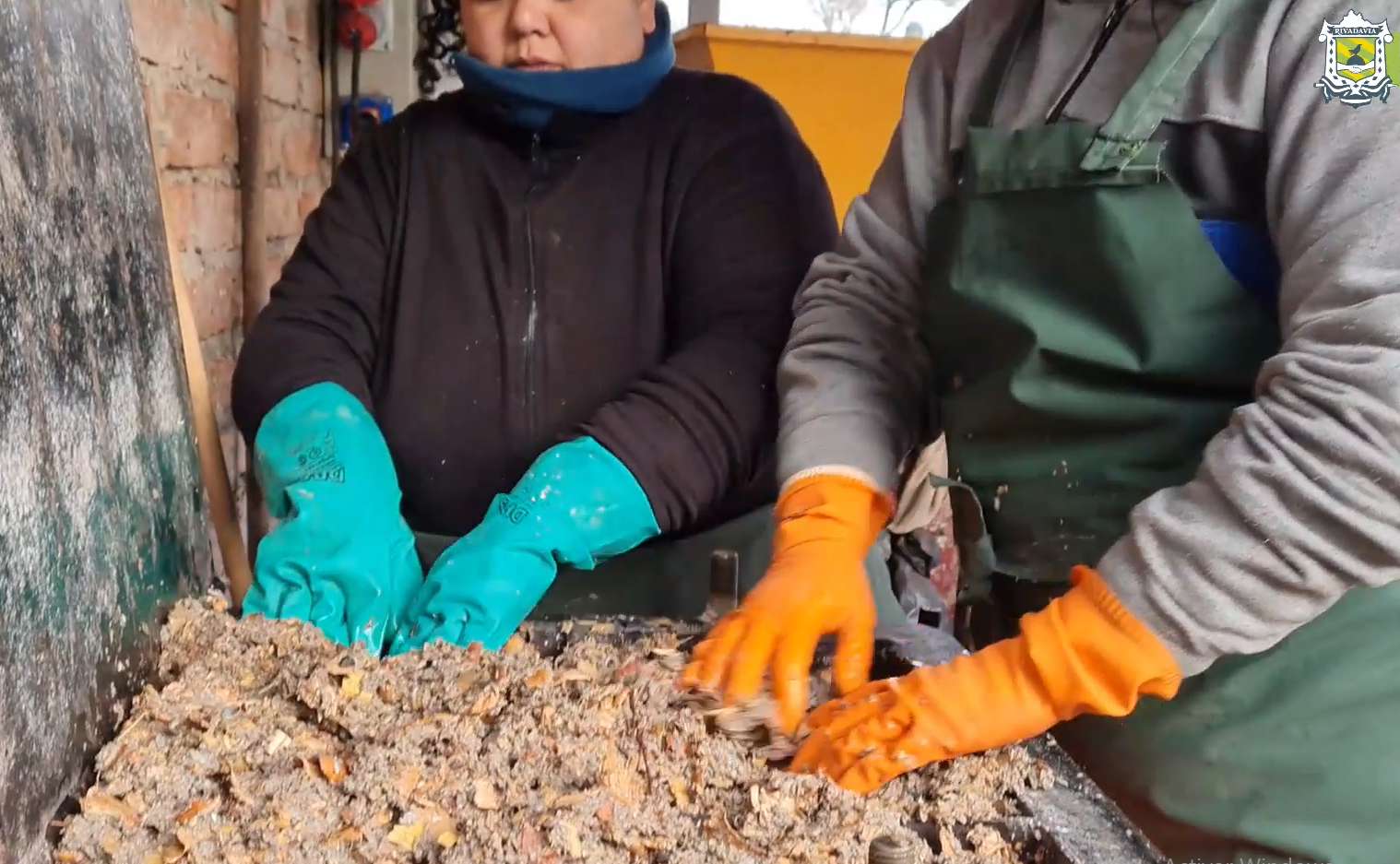 David Bertero a su turno señaló que “al principio comenzó como una prueba. La materia prima son entre otras hojas que recolecta el sector de higiene urbana, además las carpinterías donan aserrín, en el vivero obtenemos la piña y reciclamos papel de oficinas municipales y de archivo y recogemos cenizas de las parrillas públicas”. En el video además las realizadoras cuentan el proceso de elaboración de este producto.