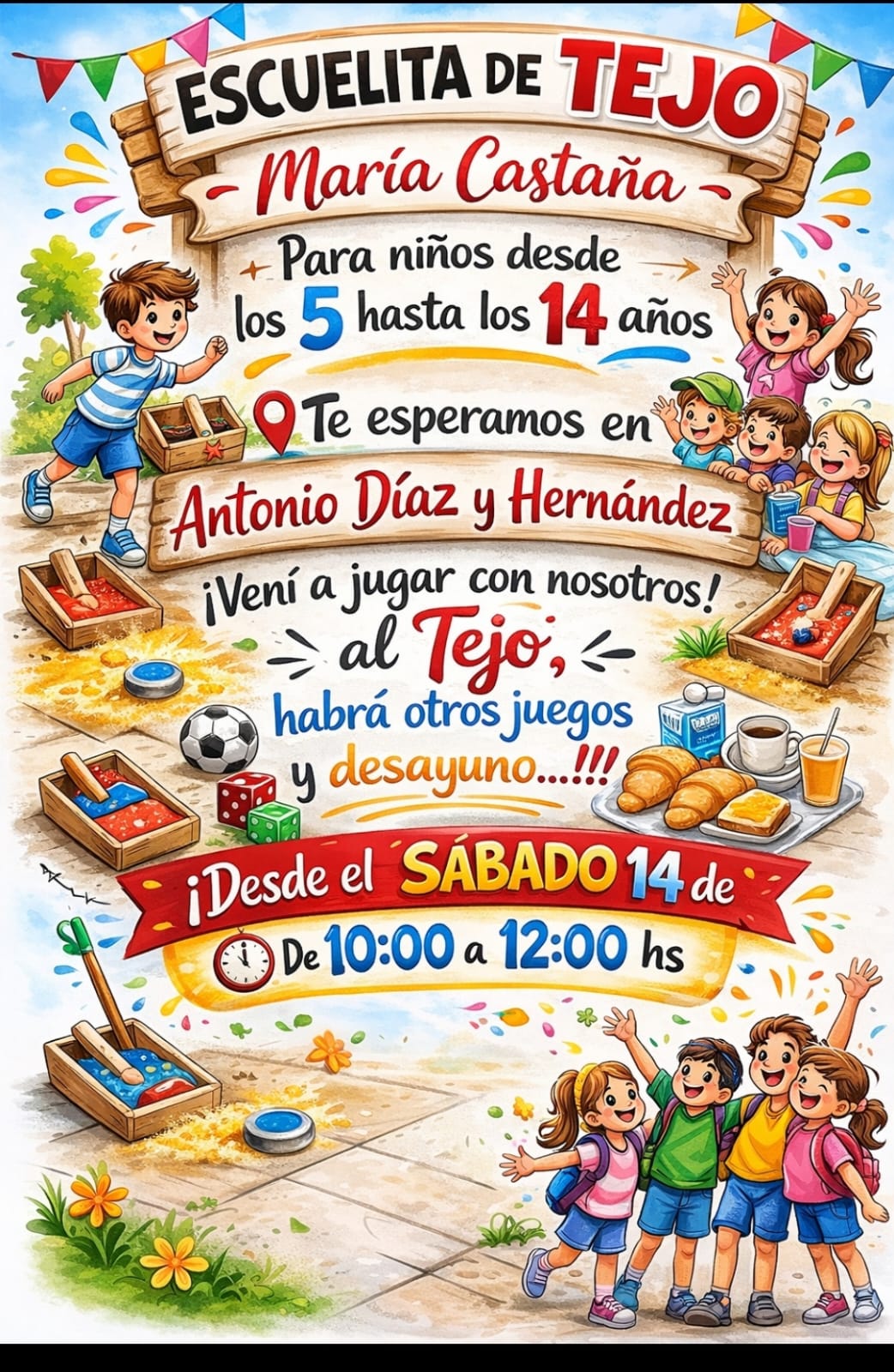 María Esther Losada anunció el inicio de una escuelita de Tejo que comenzará el sábado 14 de marzo en el espacio de María Castaña, con el aval de la Municipalidad de Trenque Lauquen. La actividad está destinada a niños y niñas de 5 a 14 años y se desarrollará todos los sábados de 10 a 12 horas.