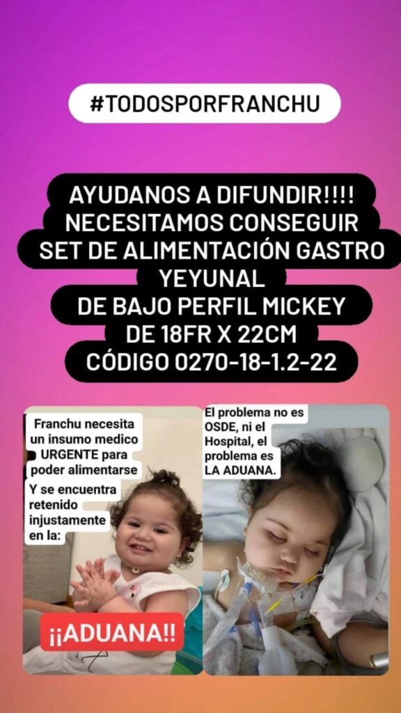 Franchesca Gómez Betanzos es una leona de 1 año y medio que desde que nació pelea por su vida. Ahora necesita un botón gástrico para su alimentación e inexplicablemente ese artefacto está retenido en la Aduana. Su familia inundó las redes sociales para que si algún hospital o centro de salud lo tenga lo pueda vender.