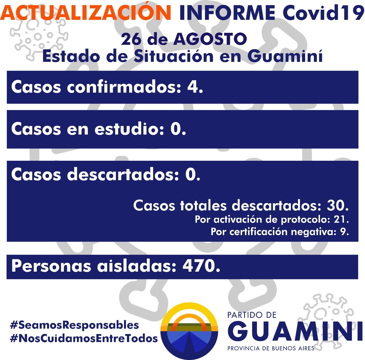 Anoche la Municipalidad de Guaminí confirmó dos nuevos casos positivos de Covid 19 por lo que el número ahora asciende a 4, mientras que no quedan casos en estudio por el momento.