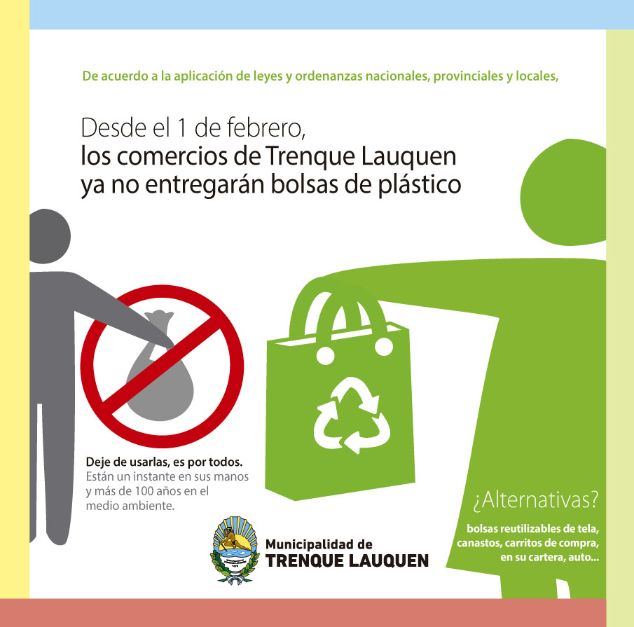 La ordenanza 4292 del 2014 que prohíbe en el Distrito de Trenque Lauquen la entrega de bolsas plásticas de único uso (tipo camiseta o similares), cualquiera sea su composición, para el transporte de mercaderías en comercios mayoristas o minoristas.