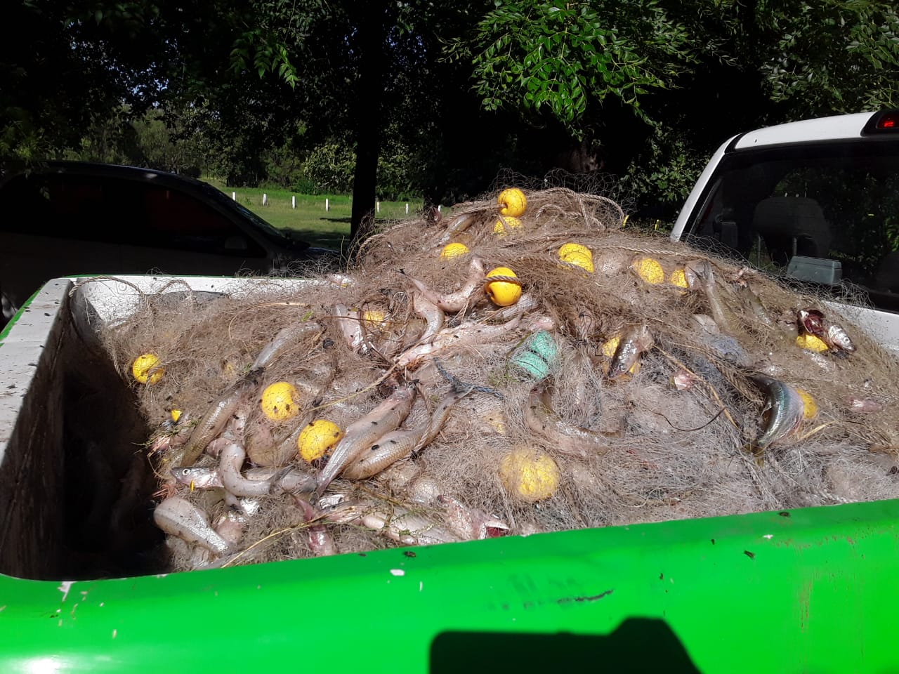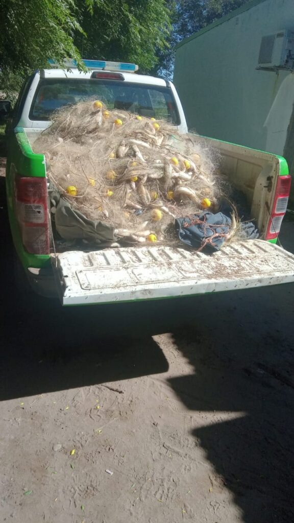 “Posteriormente se constata que dicho “bulto” estaba formado por tres paños de redes del tipo agalladeras, las que sumadas arrojan un resultado de 150 metros. Ante la evidencia de que las redes serian utilizadas (por las personas que huyeron al arribo de los efectivos policiales) para la pesca clandestina, se procedió al decomiso de las mismas y se labran las correspondientes actuaciones con injerencia del Ministerio de Desarrollo agrario provincial. Es de destacar que ante la pronta llamada a la Patrulla Rural por parte de este vecino y a la premura del arribo del personal policial, se evitó depredación o pesca ilegal de pejerrey en dicha laguna.