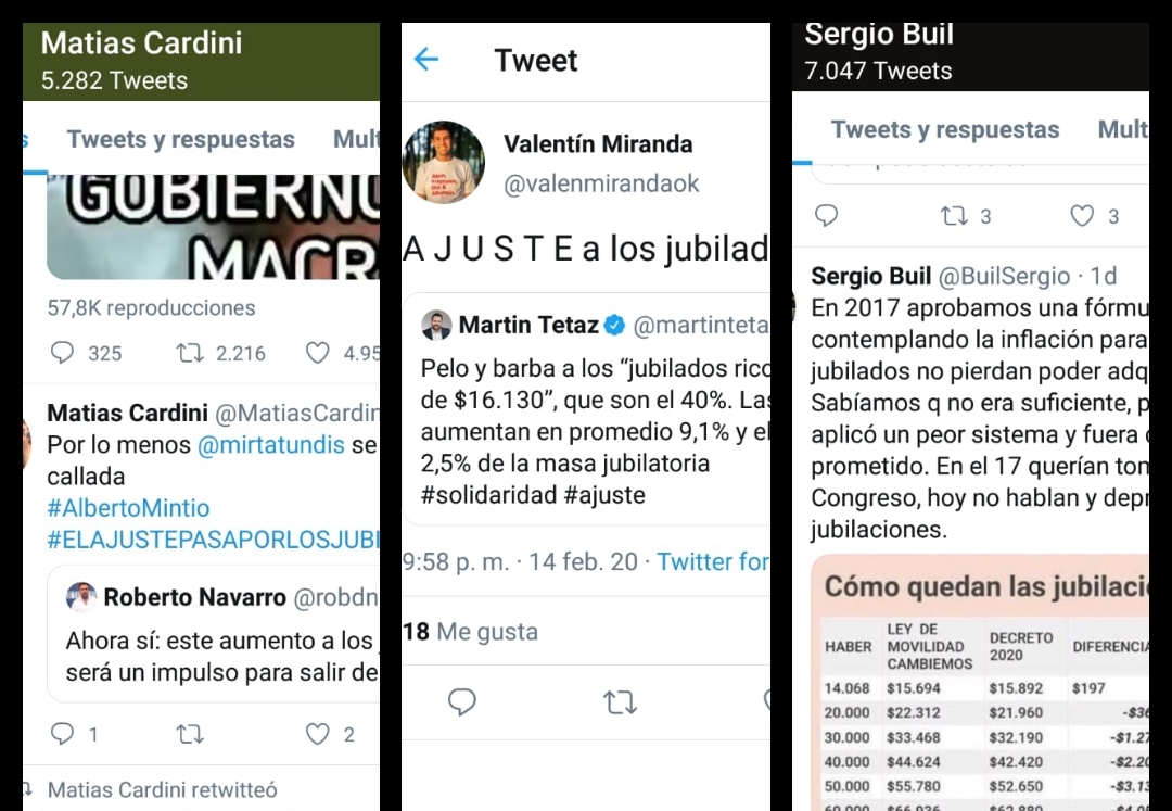 Matías Cardini, recurrió a la ironía y escribió “Por lo menos @mirtatundis se mantiene callada #AlbertoMintio #ELAJUSTEPASAPORLOSJUBILADOS” escribió citando un mensaje del periodista Roberto Navarro.