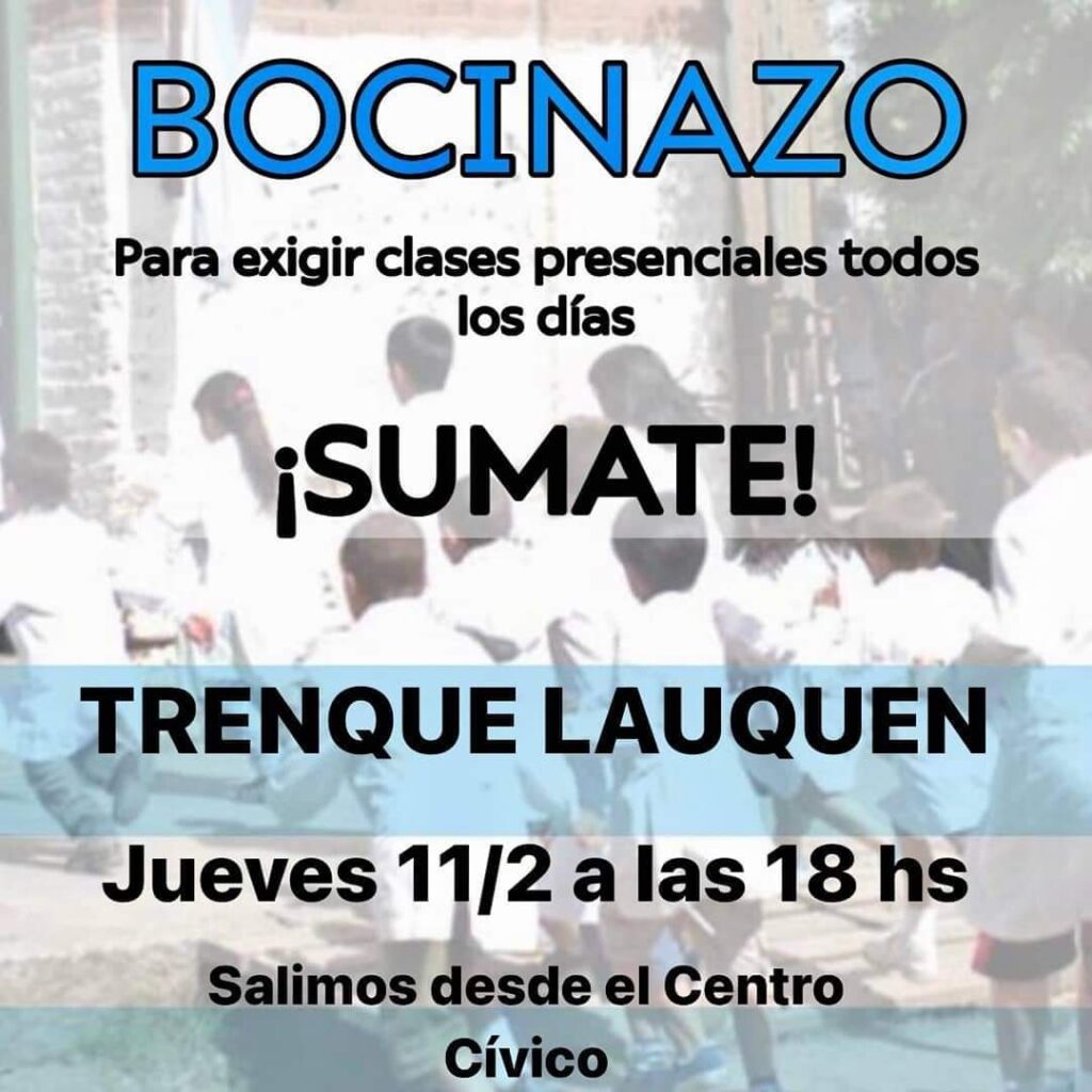 Como adelantó OESTE BA la semana anterior, el Frente Juntos por el Cambio, que en Trenque Lauquen es gobierno, realizará una manifestación en todo el país para pedir por el regreso a las aulas. Será el martes y en nuestra ciudad se eligió el Jardín 901 como sede, según señala una invitación que ya circular por las redes sociales.