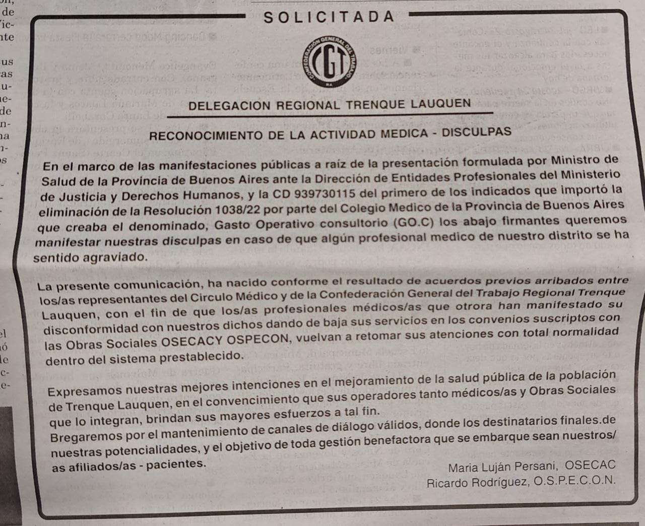 “En el marco de las manifestaciones públicas a raíz de la presentación formulada por el ministerio de salud por el cobro del gasto operativo de consultorio. Los abajo firmantes queremos manifestar nuestras disculpas en caso de que algún profesional médico del distrito se haya sentido agraviado” inicia el texto de la solicitada publicada hoy en el diario La Opinión por integrantes de la CGT Regional.