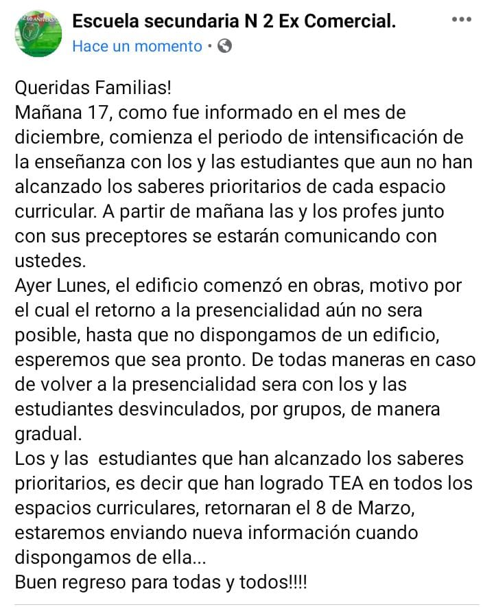 La Escuela Secundaria 2, Ex Comercial, informó a través de su cuenta oficial de Facebook a la comunidad educativa que no puede iniciar mañana el período de intensificación de contenidos previsto para el 17 de febrero, porque no tiene el edificio en condiciones y reveló en el comunicado que recién ayer lunes empezaron las obras.