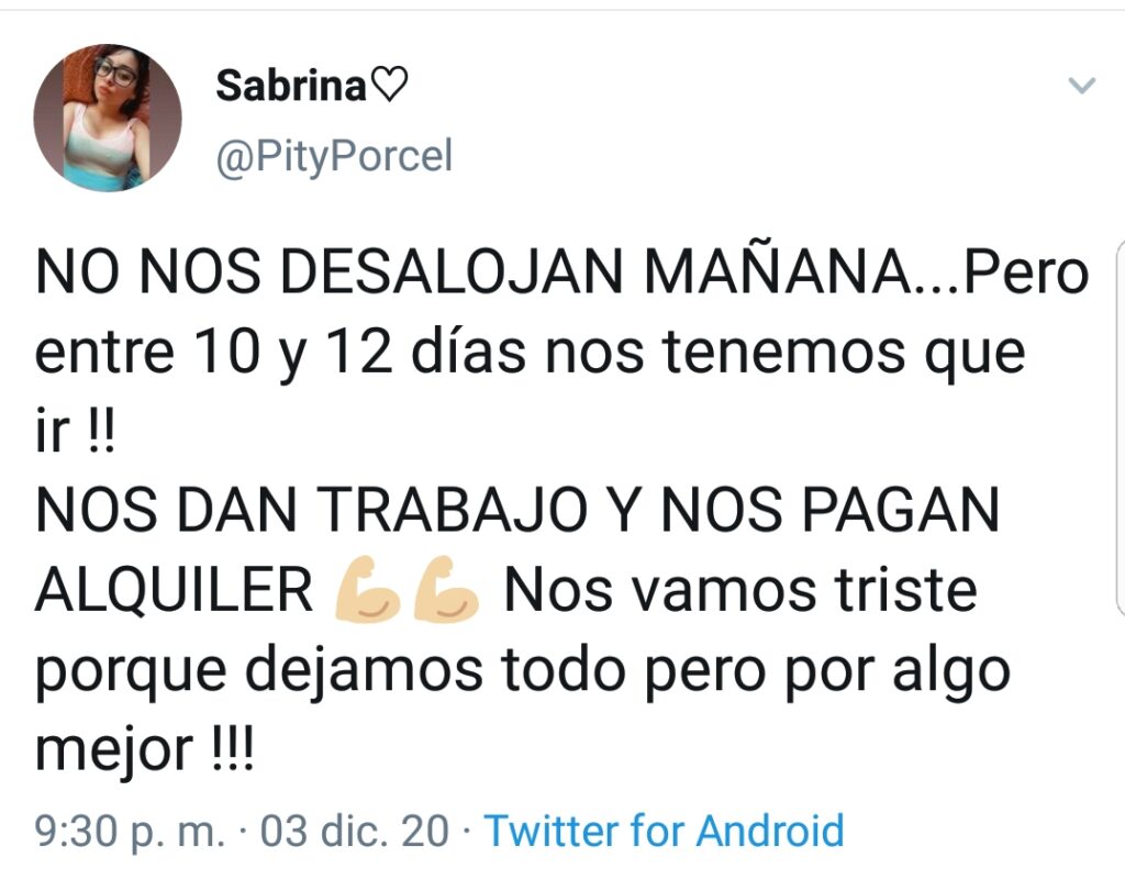 “No nos desalojan mañana…pero entre 10 y 12 días nos tenemos que ir” escribió en Twitter una de las integrantes de la familia Porcel anoche anunciando que la Justicia les dio más tiempo para dejar la quinta, para que se cumpla la orden de desalojo que en primera instancia debía…