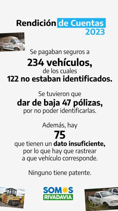 «Se pagaban seguros a 234 vehículos, de los cuales 122 no estaban identificados. Se tuvieron que dar de baja 47 pólizas, por no poder identificarlas. Además, hay 75 que tienen un dato insuficiente, por lo que hay que rastrear a que vehículo corresponde y ninguno tiene patente», explicaron desde el actual oficialismo.