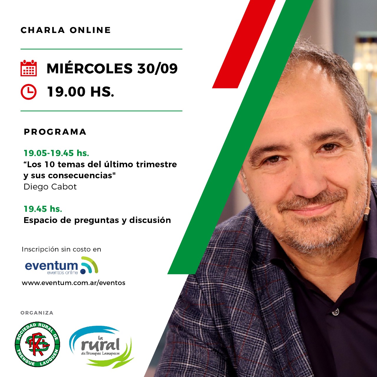 La Sociedad Rural de Trenque Lauquen organiza e invita a la charla «Los 10 temas del último trimestre y sus consecuencias» en donde el disertante principal será el periodista Diego Cabot.