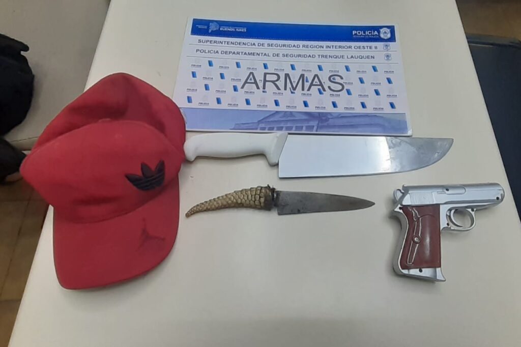 Los efectivos policiales al momento de su aprehensión, le incautan al aprehendido un replica de un arma de fuego, símil a una pistola, y dos armas blancas siendo una de ellas una cuchilla marca arbolito de 25 cm de largo de hoja y un cuchillo de aproximadamente 15 cm de hoja, cabo cola peludo, las cuales las tenía en su poder entre sus ropas.