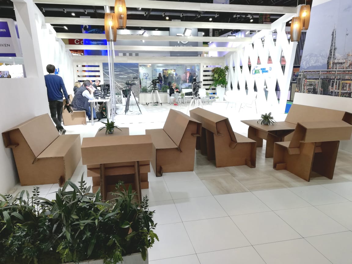 Entre las grandes producciones se encuentra la realización de mobiliario para escuelas, entre ellas la primera escuela pública sustentable de Argentina que se hizo en Mar Chiquita. “Nosotros aportamos mobiliario en cartón para el inicio del proyecto ahora estamos retomando el trabajo con ellos, no sólo para el uso del mueble sino para el trabajo curricular de reciclado del mismo cartón”.