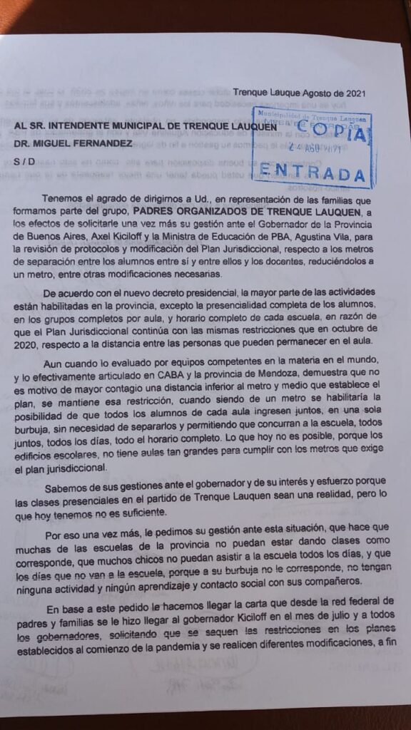La nota que entró hoy a la Municipalidad señala: “Tenemos el agrado de dirigirnos a Ud., en representación de las familias que formamos parte del grupo, PADRES ORGANIZADOS DE TRENQUE LAUQUEN, a los efectos de solicitarle una vez más su gestión ante el Gobernador de la Provincia de Buenos Aires, Axel Kiciloff y la Ministra de Educación de PBA, Agustina Vila, para la revisión de protocolos y modificación del Plan Jurisdiccional, respecto a los metros de separación entre los alumnos entre sí y entre ellos y los docentes, reduciéndolos a un metro, entre otras modificaciones necesarias.