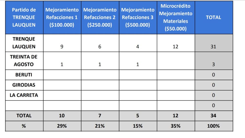 Los resultados del primer sorteo del 28 de agosto del Procrear, para los segmentos refacción y mejoramiento incluyeron 34 familias de Trenque Lauquen, según se informó oficialmente desde el área de prensa del FdT con un PDF enviado a medios locales.