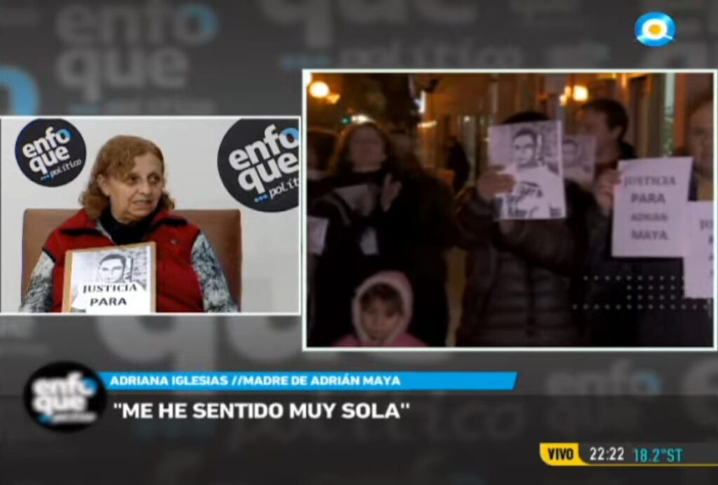“Las noches son las más difíciles, son largas y no siempre se puede dormir” dice Adriana Iglesias, madre de Adrián Maya asesinado hace casi 5 años. Sostiene en sus manos un cartel que pide justicia por su hijo, y relata con tono pausado y cargado de dolor la angustia que atraviesa.