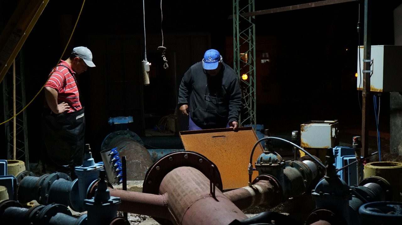 En la madrugada de hoy viernes (3), personal municipal de la Dirección de Servicios Sanitarios, a cargo de Gustavo Achaerandio, trabajó intensamente en la reparación de dos de las tres bombas sumergibles ubicadas en la cisterna que inyecta y eleva agua hacia la Copa, además de dos caños que también presentaban roturas.