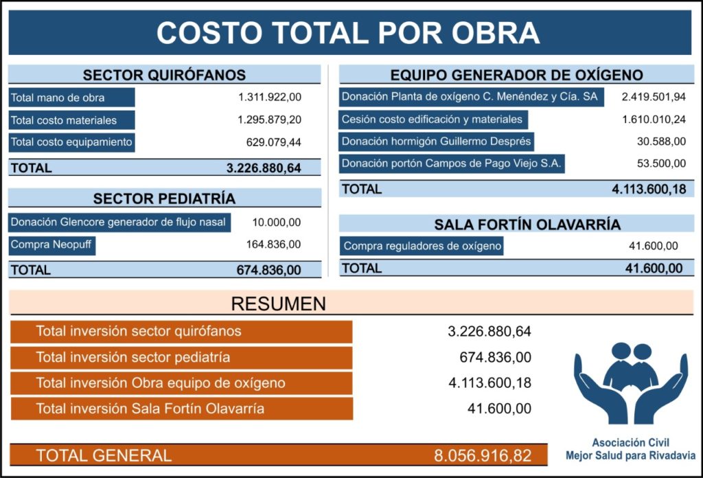 Al igual que el Municipio, la Asociación Mejor Salud para Rivadavia publica anualmente sus balances financieros -como institución del tercer sector- en Gobierno Abierto, destacando la transparencia en la gestión de sus insumos. La obra del equipo generador de oxígeno implicó un gasto de $4.113.600.