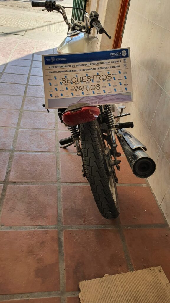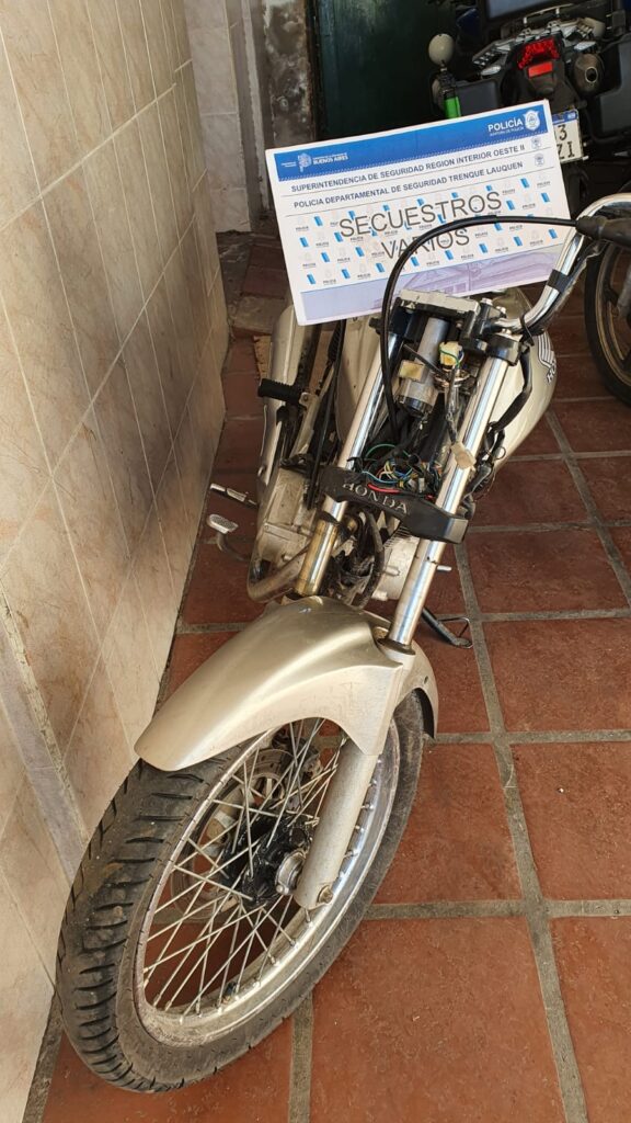 Posteriormente, raíz tareas investigativas desarrolladas, el Sr. Fiscal Dr. Iglesias, otorga una orden de allanamiento de urgencia el cual se ejecutó con efectivos de Comisaría Trenque Lauquen, GAD y DDI local, en una vivienda de la calle Carabelli al 1100 donde se procede a secuestrar una motocicleta marca Honda CG Titan, prendas de vestir y demás elementos de interés para la causa. Además se procedió a la aprehensión del tercer sujeto identificado como Villarruel Kevin Agustin de 18 años de edad, se informó en un comunicado policial.