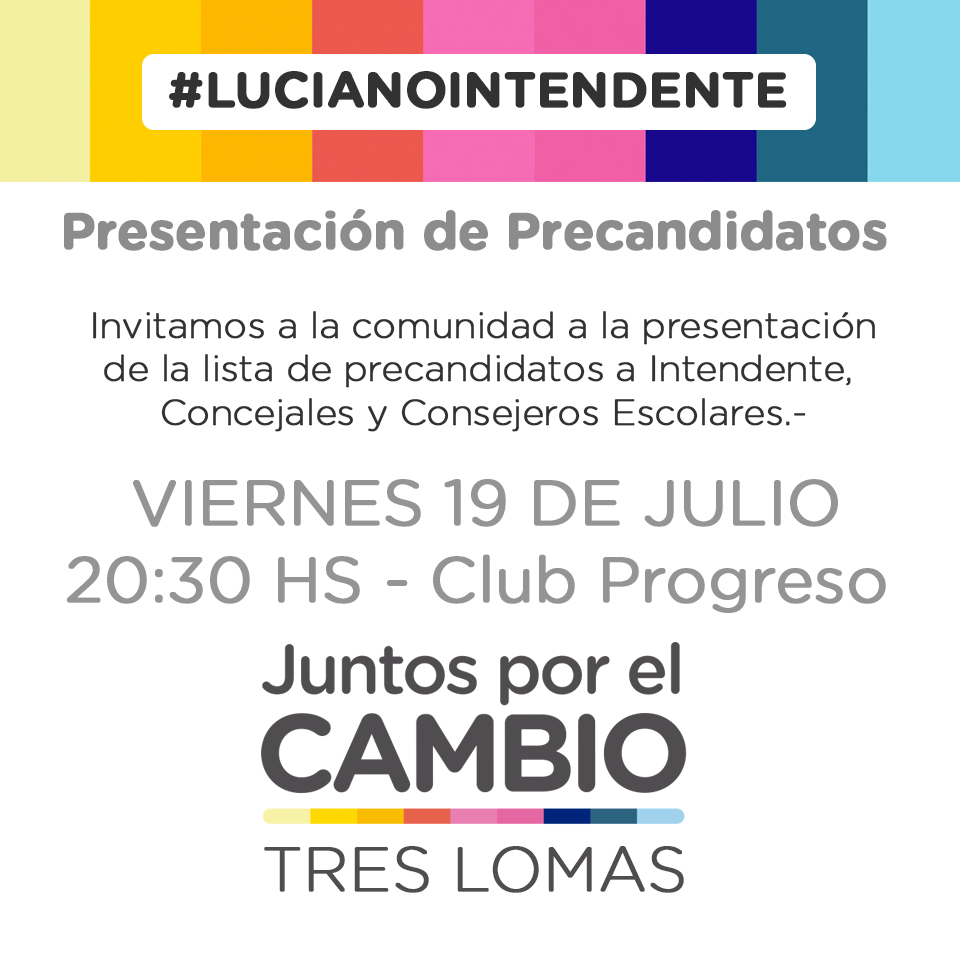 Este viernes 19 de Julio a las 20.30 hs. en el Club Progreso de Tres Lomas, Juntos por el Cambio realizará el lanzamiento de campaña y la presentación pública de sus precandidatos de cara a la próximas elecciones PASO del 11 de agosto.