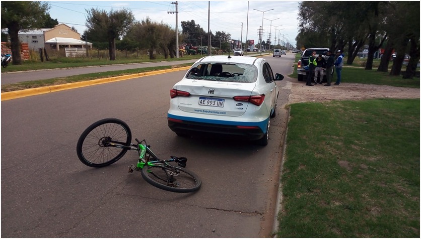 La Policía informó sobre el choque de una bicicleta marca Venzo, rodado 29 conducida por ciudadano Pincen Cristian de 31 años, de edad, con vehículo marca Fiat modelo Cronos color blanco el cual se encontraba estacionado con balizas encendidas en acceso Garcia Salinas este medio, encontrándose conductor Palmieri Sebastián Ismael de 36 años de edad en interior rodado, a consecuencia del accidente el ciclista fue trasladado al Hospital local, donde se dictamina que el mismo presenta lesiones carácter graves, escoriaciones en rostro y lesión ojo izquierdo, se instruye causa penal caratulada lesiones graves culposas, con intervención de la Fiscalía N° 05 Departamental.