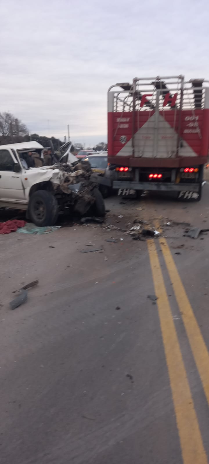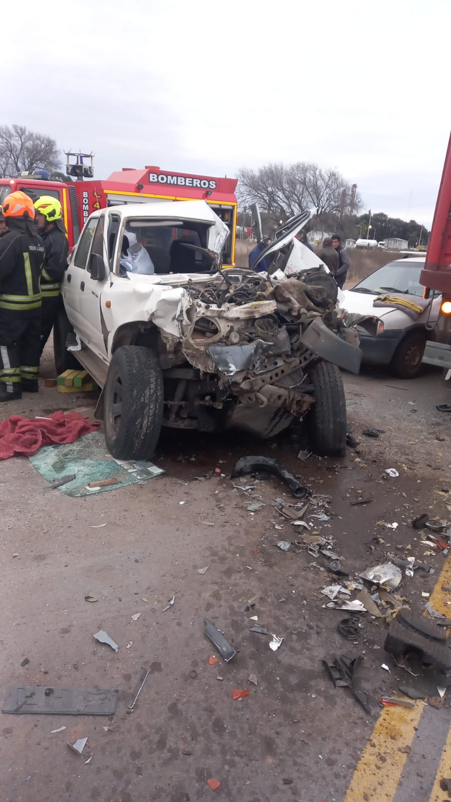 Según se informó golpeó con el acoplado de un camión VW 17280 conducido por López Santiago (22) de Carhué que resultó ileso. Después de impacto un tercer vehiculo choca frontalmente con los anteriores, un Chevrolet Corsa, conducido por Charamone Javier (55) acompañado por Charamone Dario (52), Martinez Sergio (58) y Larcebo Braian David, todos de Trenque Lauquen y resultaron ilesos.