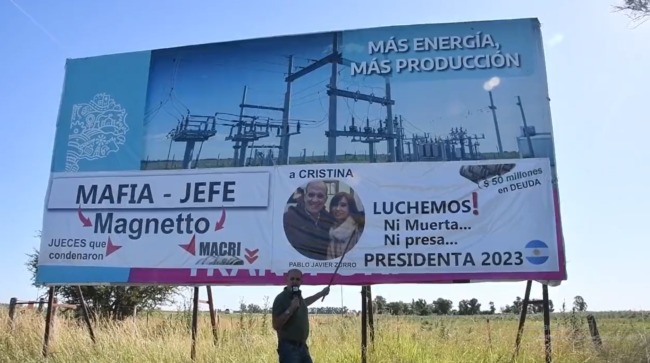 Zurro colocó un cartel en la ruta para defender a Cristina y denunciar las “mafias”