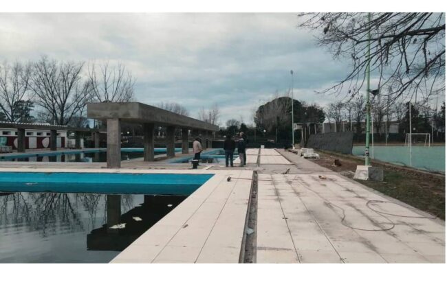 Se está colocando el piso atérmico en el sector del solárium del complejo de piletas de Pellegrini