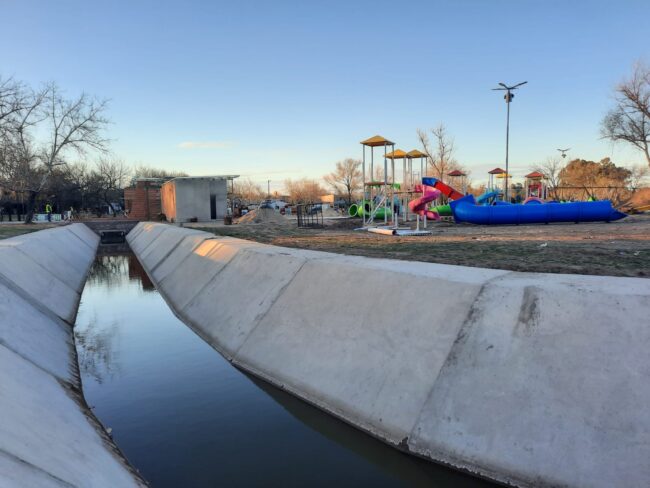 El renovado sector de juegos y los canales de agua ya se dejan ver en el nuevo Parque
