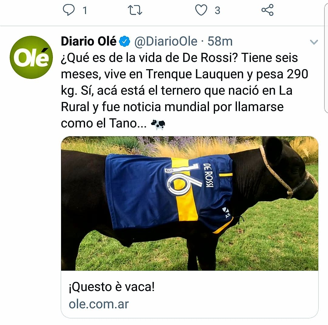 Una curiosa nota del diario Olé se publicó hoy, fue una entrevista a una familia local por la historia de un ternero. Esta es la nota completa: “La llegada del Tano Daniele De Rossi a Boca generó tanta pero tanta repercusión que en julio del 2019 a un ternero nacido en La Rural (en el box de la Cabaña Santa Cecilia) lo bautizaron De Rossi en su honor. Y, claro, este ternerito Angus, que pesó 29 kilos, fue noticia en los portales del país y hasta en algunos del exterior. Días después, mientras el futbolista se ponía a punto para debutar en Boca, el ternerito dio sus primeros pasos en la Pista Central de La Rural, junto a su madre, Blancanieves. «Se nos ocurrió ese nombre porque toda la familia es hincha fanática de Boca y justo coincidía con la llegada del Tano al club», cuenta Francisco Eyherabide, de 21 años, uno de los dueños del ternero.