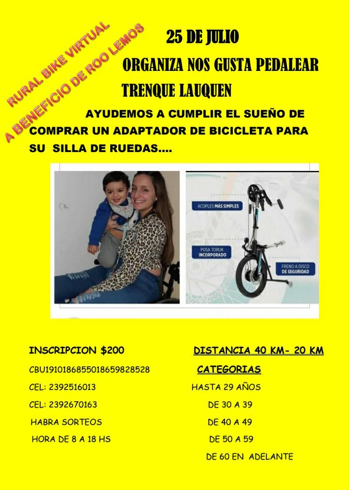 “Rocío quiere comprar un adaptador de bicicletas, para llevar a su hijo al jardín por tal motivo decidimos colaborar. Es una carrera de rural bike el domingo 25 de julio entre las 8 y 18 horas. Los interesados pueden anotarse en distintas categorías por edad y para correr en 20 ó 40 kms” dijo la entrevistada que si bien destacó que habrá una clasificación se trata de una acción solidaria más que competitiva.