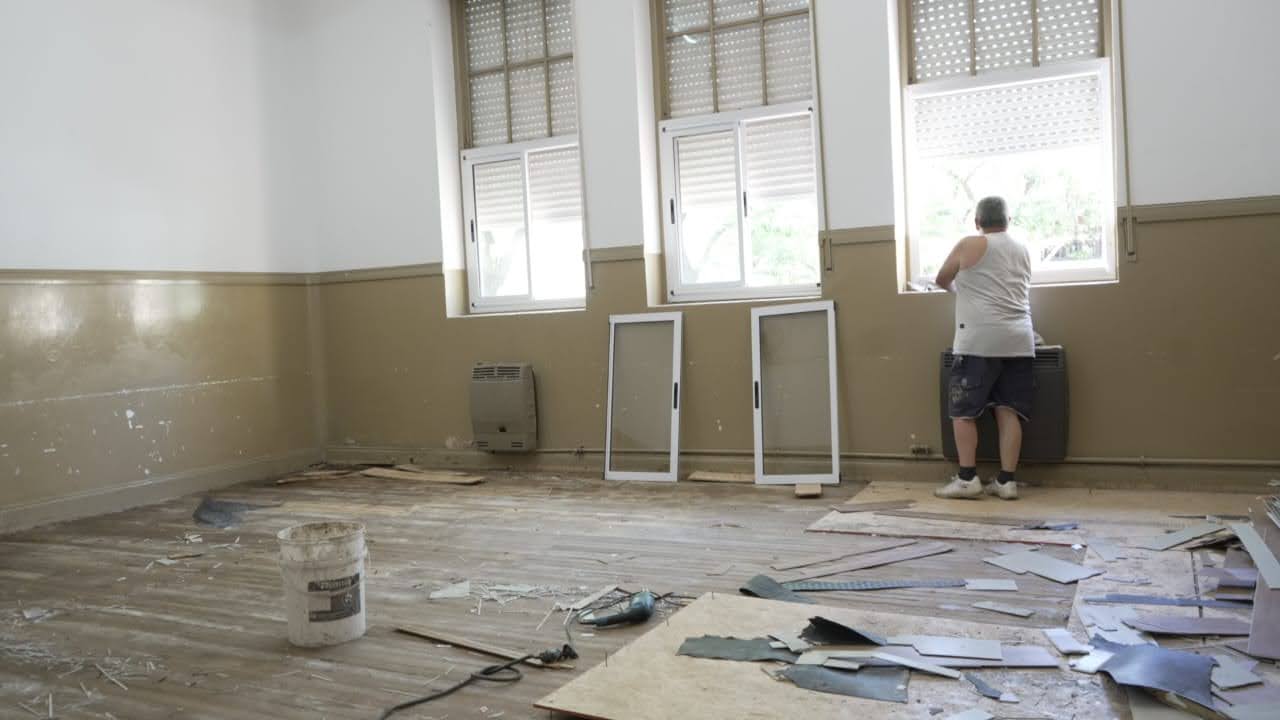 Los trabajos a realizarse en el histórico edificio de la Escuela Primaria n° 1, ubicado en la esquina de las calles Paso y Belgrano, consisten en retirar los pisos de las aulas de planta baja, desarmando el vinílico rígido que se encuentra instalado sobre una base de madera aplicada sobre la pinotea original, con su respectiva manta de aislación.