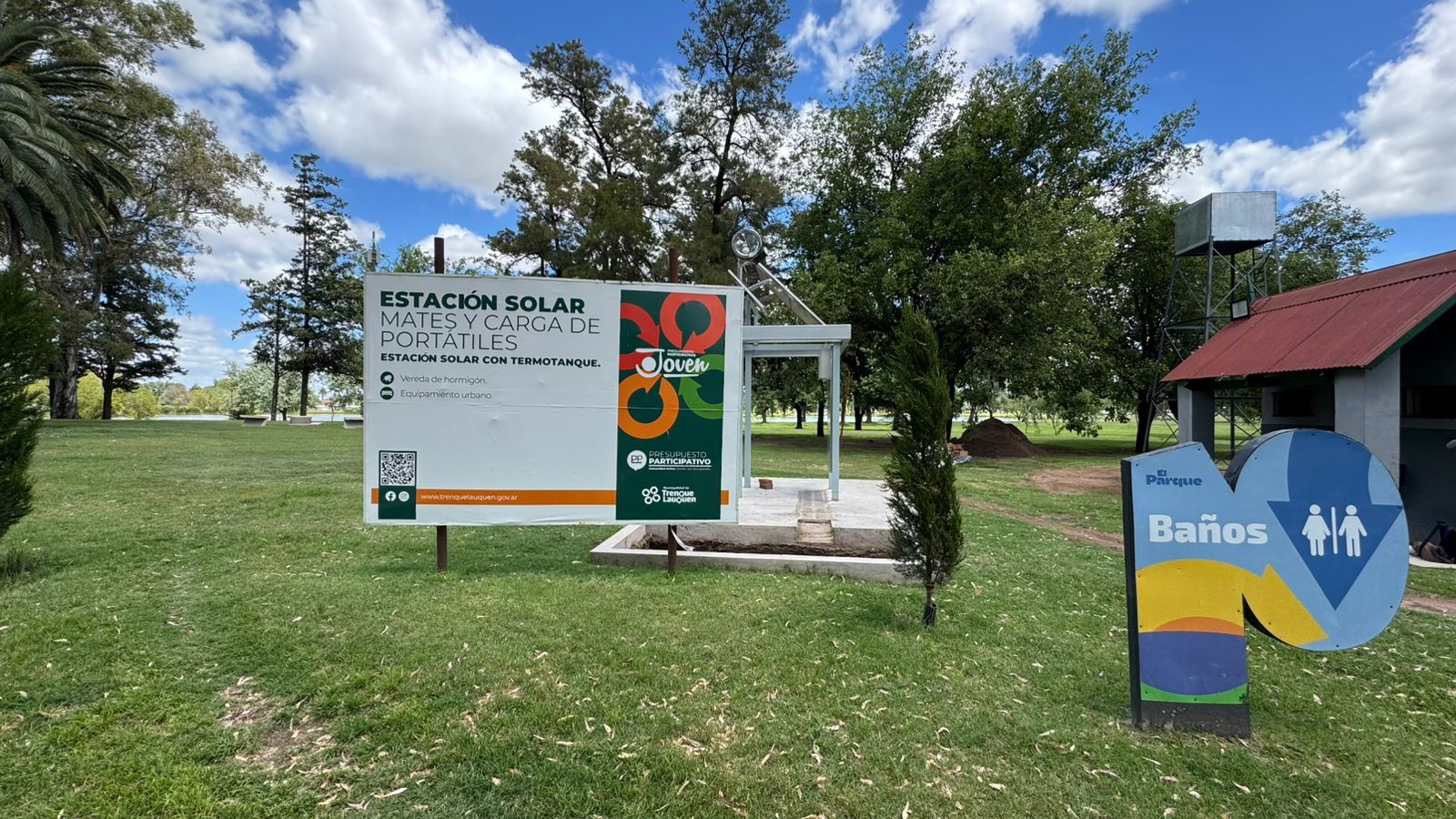 Se trata del proyecto ganador del Presupuesto Participativo Joven que servirá para brindar energía para la carga de agua para termos y también incluye un sector para la carga de elementos electrónicos portátiles con puertos USB