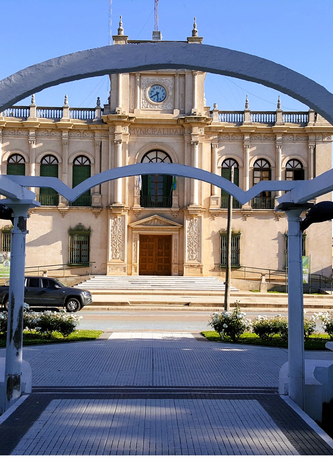 En planta baja el ingreso se da por el cuerpo central y se encuentra elevado por una escalinata de mármol, junto con una imponente abertura doble hoja de madera, que conserva sus características originales. El cuerpo central principal se corona con una torre que aloja el reloj.